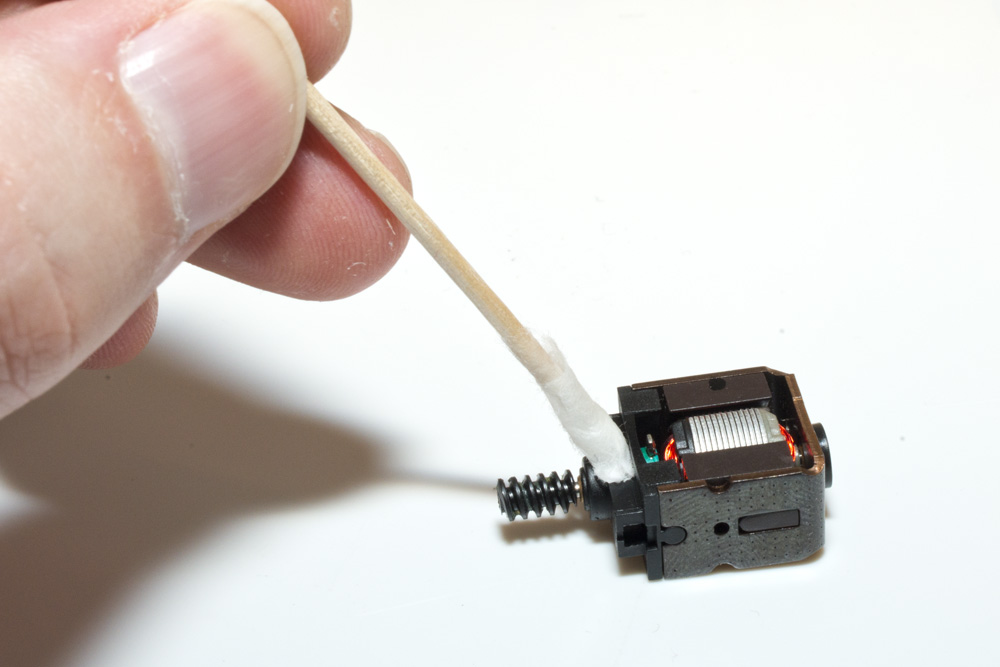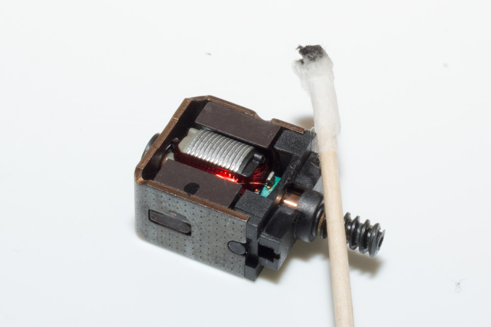 Viele Loks kommen völlig verölt bei uns Modellbahnern an. Da sie eine lange Reise in ihren Schachteln liegend hinter sich haben, verteilt sich die Suppe gerne in der ganzen Lok. Auch der Motor bleibt davon nicht verschont. Nun ist es mit dem Öl aber so, dass es an der richtigen Stelle perfekt seinen Dienst verrichtet, aber an anderen völlig unnütz, sogar schädlich ist. Das beste Beispiel ist der Motor. Die Lager sollten niemals völlig trocken laufen, Kollektor und Kohlen aber unbedingt. Denn Öl in den Kohlen macht sie weich, sie erzeugen mehr Abrieb und die Öl-Kohle-Pampe verschmiert die Spalten des Kollektors, was zu Kurzschlüssen führen kann. Analog macht sich das in einem erhöhten Strombedarf bemerkbar, digital kann es im schlimmsten Fall den Decoder kosten.